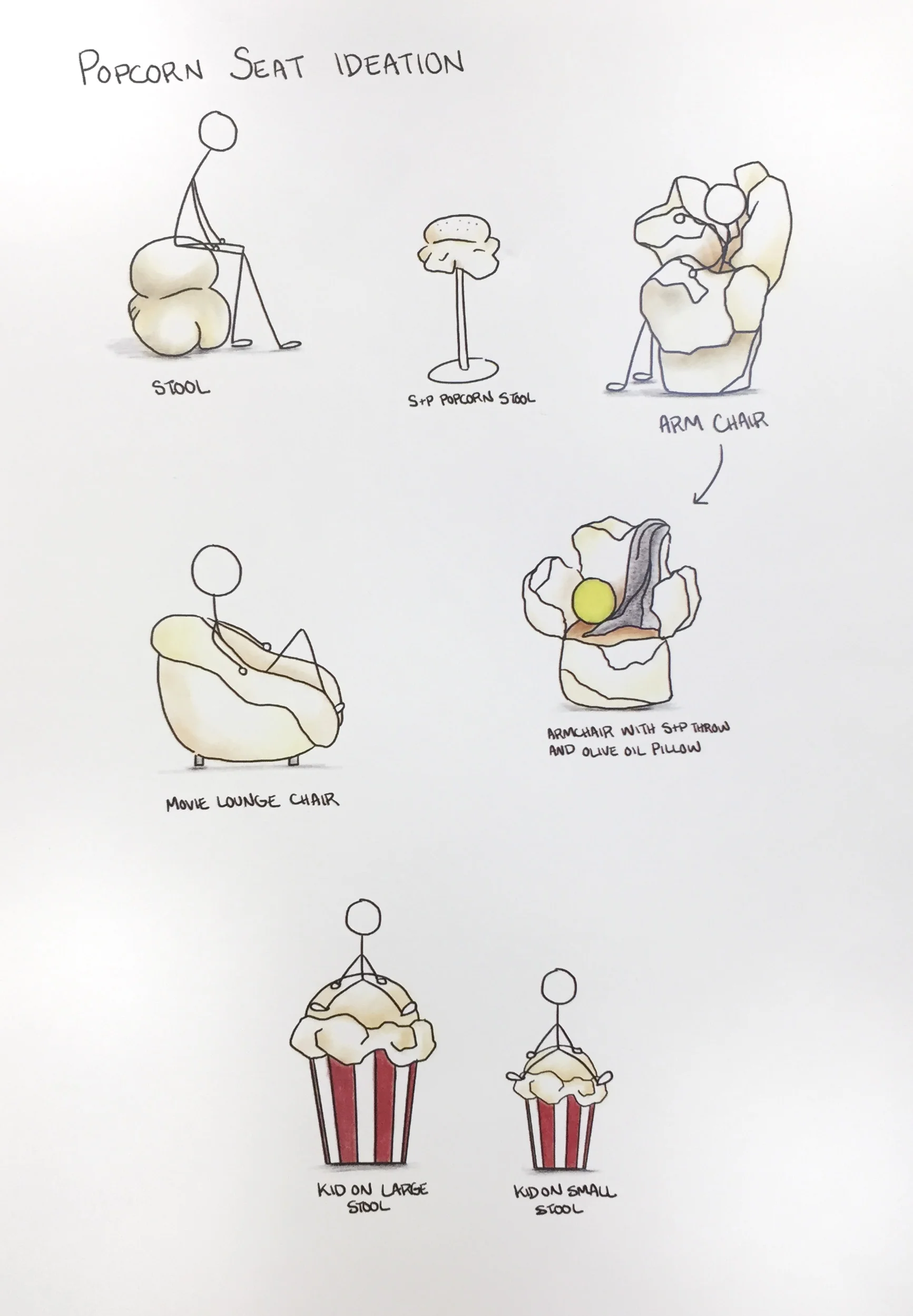 To understand why popcorn was important to me I analyzed its physical attributes (color, form, texture, motion, etc.) and created drawings, audio recordings, videos, mood boards, and mind maps.