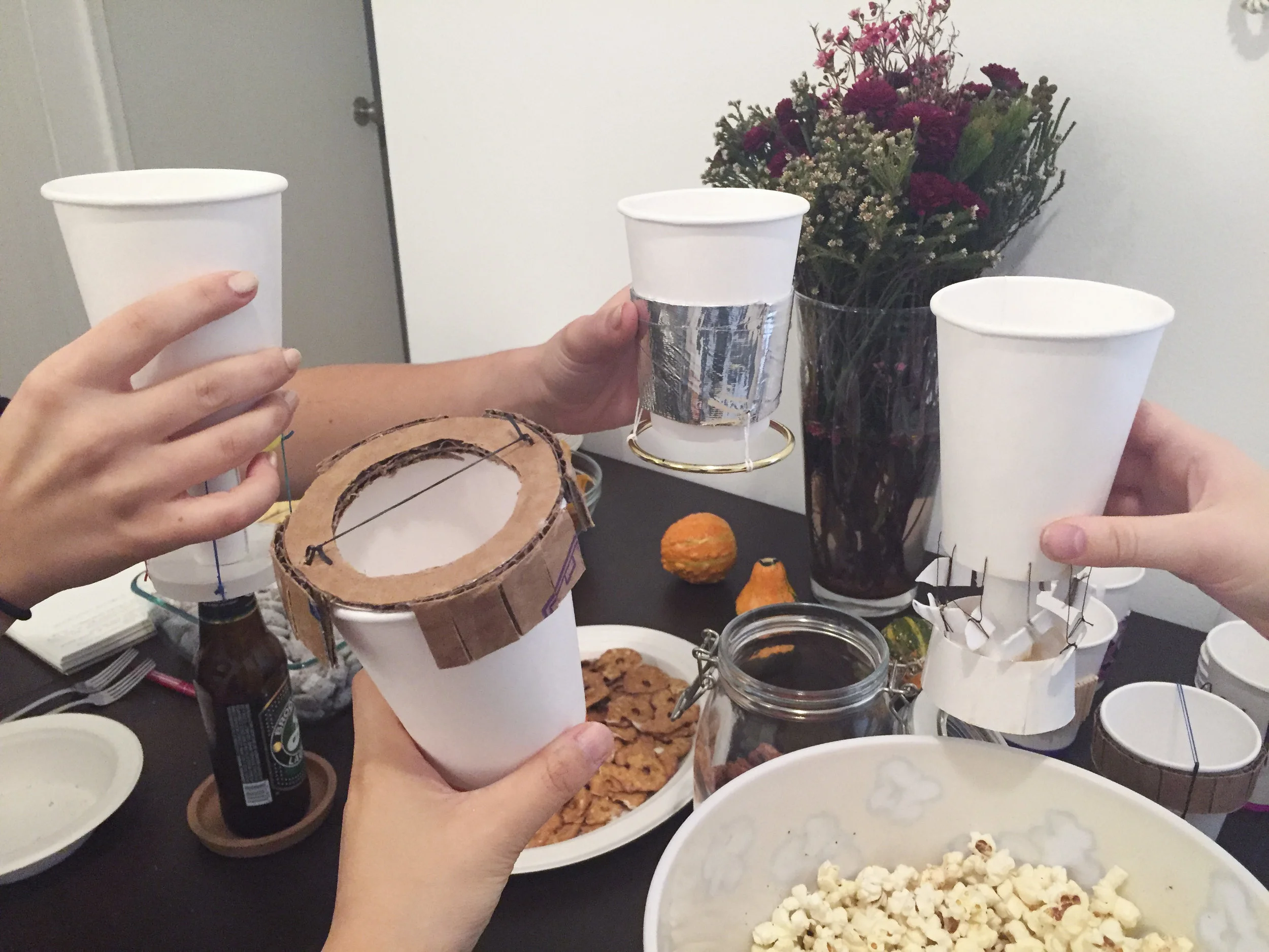 Musical Cheers began with my love of popcorn. I was inspired by the anticipation I felt when my mom made stovetop popcorn. I would hear the cabinets opening, the popcorn pot hitting the stove, the kernels pouring into the pot, the oil crackling, the cranking of the handle, and of course, the popcorn popping. Once the popcorn was done everyone would gather around the freshly popped popcorn bowl and enjoy each other's company. When I got old enough to make popcorn myself, anticipation came from knowing I was going to share my creation with others. I wanted to design a product that brought food and drink, sound, anticipation, and sharing together.
